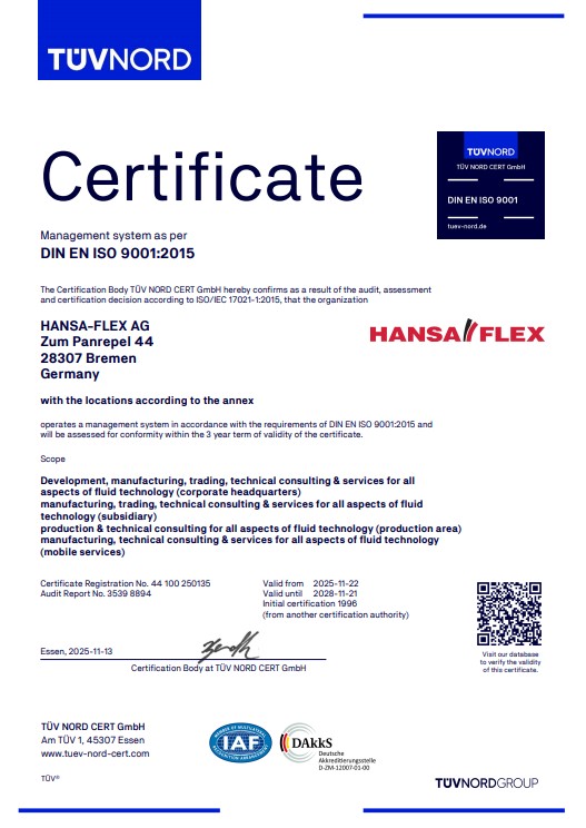 Spoločnosť TÜVNORD certifikovala používanie systémov riadenia spoločnosti HANSA-FLEX v súlade s normou EN-ISO-9001:2015, a to podľa postupu TÜV NORD CERT pre „vývoj, výrobu, obchod a technické poradenstvo, ako aj služby súvisiace s fluidnou technológiou“.